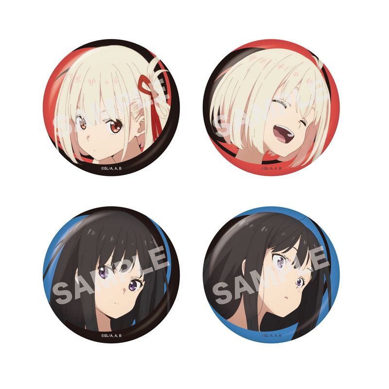 『リコリス・リコイル』より、デザインの一部がキラキラ光るメタリック仕様の缶バッジが登場しました。
